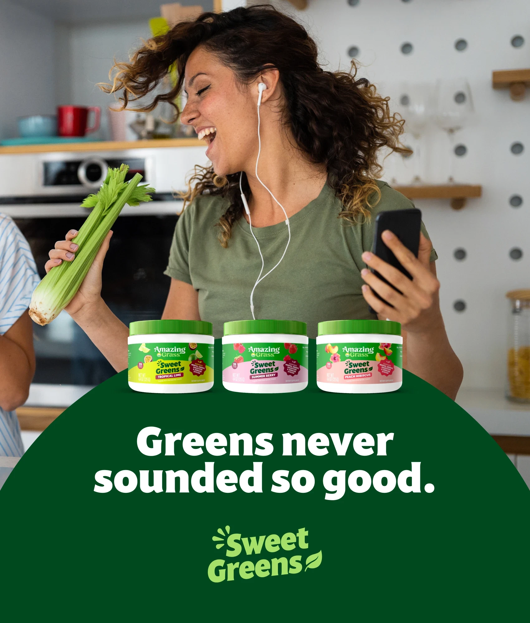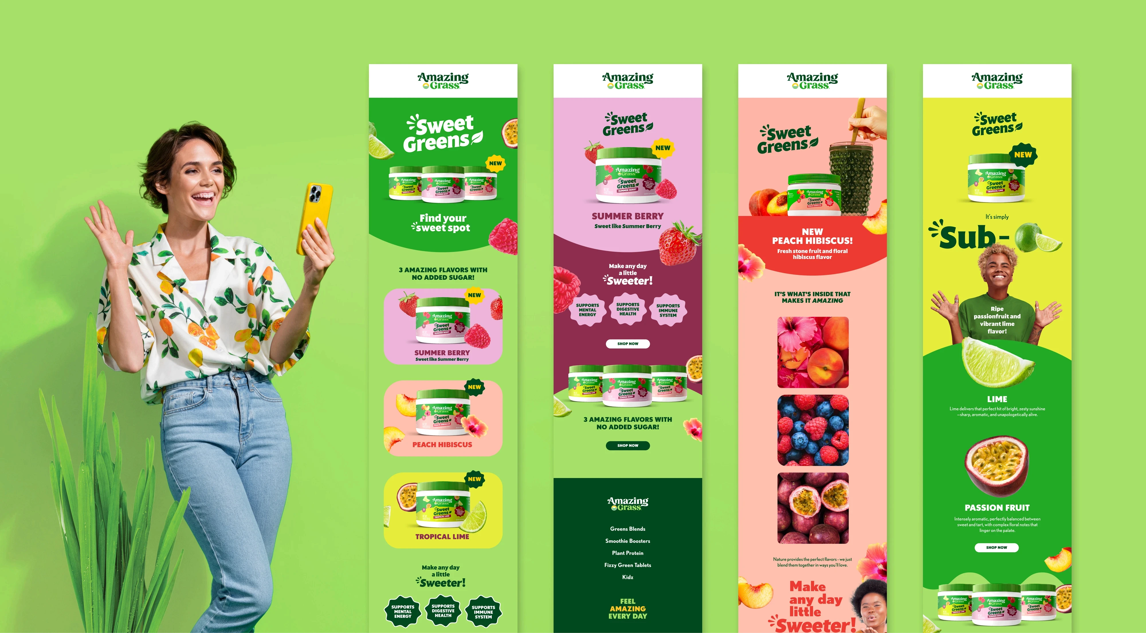 Sweet Greens required a shift in how the brand showed up emotionally. The expression moved away from a primarily functional, wellness-led tone toward something more expressive, flavor-forward, and enjoyable, while remaining grounded in the credibility of Amazing Grass.